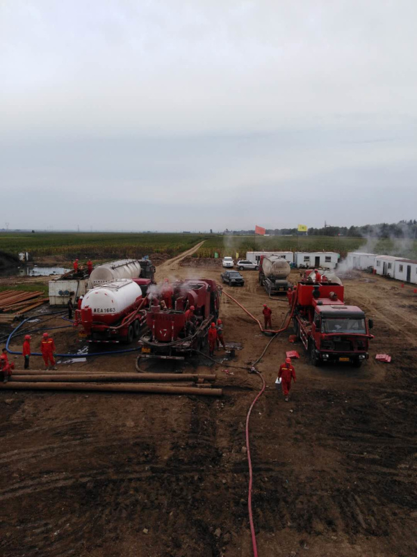 2018年8月23日,大慶市東油鉆采有限公司固井隊對這口井進行完井固井施工。注灰低密度55方,原漿22.5方,替泥漿32.2方,水泥漿返出地面,施工**順利,一切正常,很圓滿。